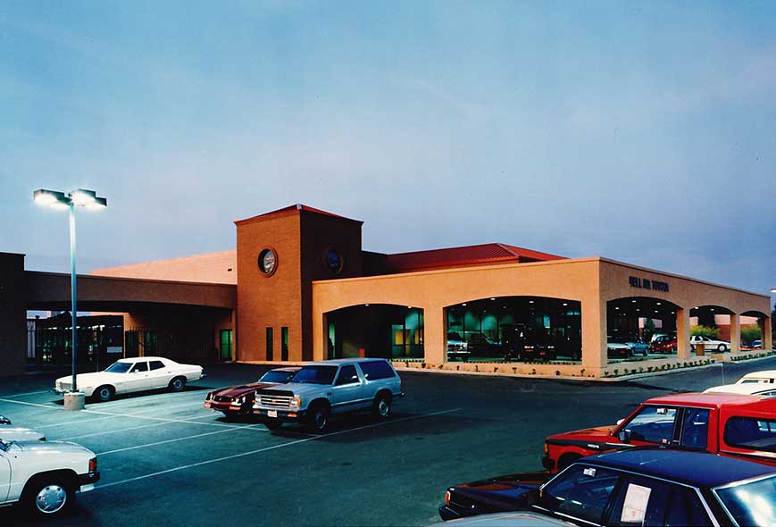 Automotive facility uses for metal buildings include showrooms, parts storage, service facilities and car rental. Steel roof structures for shade are a must in the Southwest.